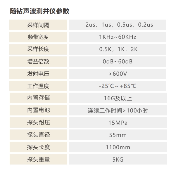 隨鉆聲波設(shè)備系統(tǒng)主要由控制主機、計數(shù)裝置(鉆桿計數(shù)、線纜計數(shù))、隨鉆聲波探頭組成,聲波探頭是集壓電陶瓷換能器、發(fā)射電路、信號采集數(shù)字化、數(shù)據(jù)存儲器、電源于一體,適用于垂直孔、水平孔、斜孔檢測;測試過程控制主機與聲波探頭無需數(shù)據(jù)電纜連接,聲波探頭自采自存(盲采數(shù)據(jù)),聲波探頭連接鉆桿,鉆機推入鉆孔檢測,設(shè)備輕便,操作簡單,且設(shè)備安全可靠。 支持超深垂直孔檢測,采用輕便的線纜懸掛聲波探頭,通過全自動線纜計數(shù)裝置下方即可進行檢測,解決了遠距離數(shù)據(jù)線纜傳輸問題。