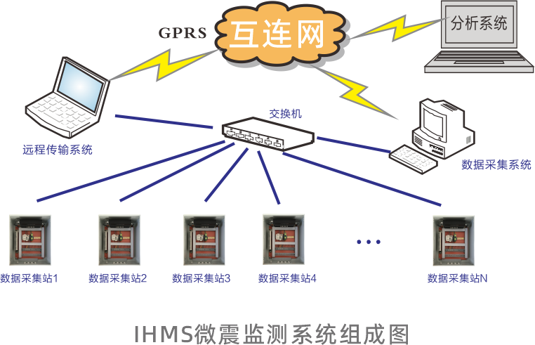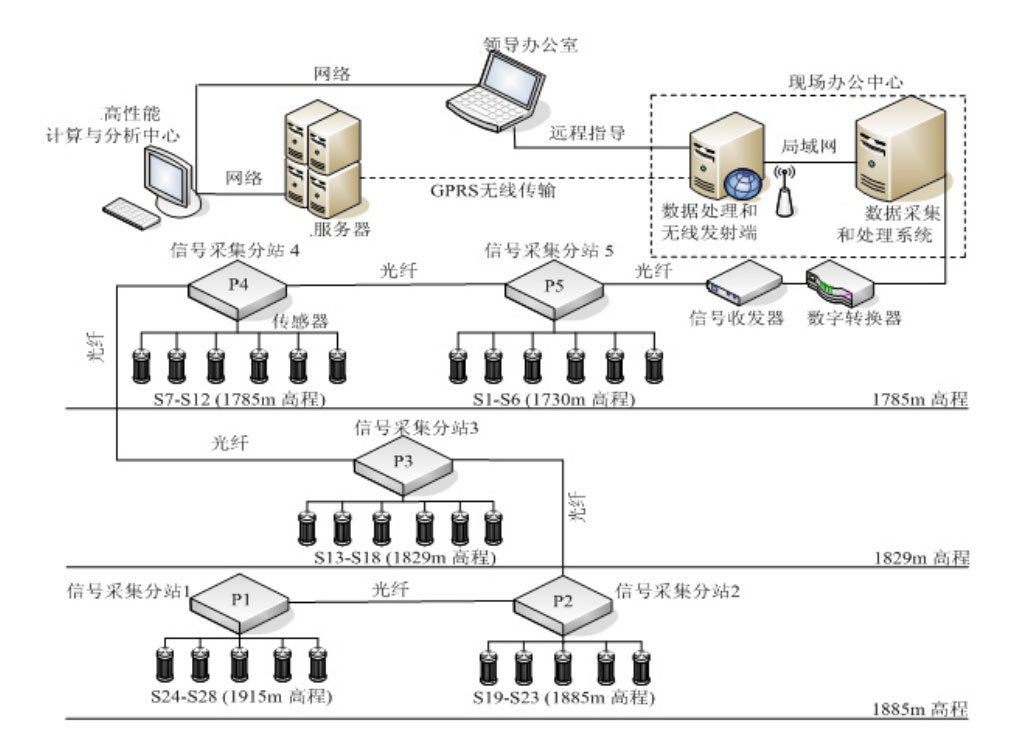 系統(tǒng)主要由監(jiān)測傳感器、數(shù)據(jù)采集站、傳輸光纜 網(wǎng)線、GPS授時同步模塊、數(shù)據(jù)綜合處理主機(jī)(含微震數(shù)據(jù)實時采集)、無線數(shù)據(jù)傳輸系統(tǒng)、短信報警系統(tǒng)、事件定位與數(shù)據(jù)分析軟件等組成。具有低功耗、高采樣率、高信噪比、方便易用等特點。由于采用分布式設(shè)計,多個微震數(shù)據(jù)采集站可通過光纖級聯(lián),最大可拓展至2048個數(shù)據(jù)采集通道,最大監(jiān)測范圍達(dá)80KM。可通過無線模塊回傳數(shù)據(jù)、遠(yuǎn)程管理設(shè)備,支持手機(jī)短信故障報警,數(shù)據(jù)綜合處理分析中心完成微震動事件的時空定位和其他分析處理。