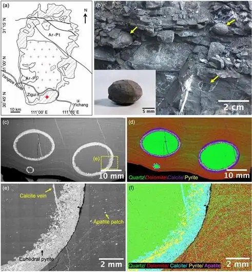湖北宜昌三峽九龍灣剖面埃迪卡拉系陡山沱組發(fā)育完整、出露連續(xù)、變質(zhì)程度低,是開展該時(shí)期古環(huán)境、古生物與地層學(xué)研究的理想剖面(圖1a)。該剖面陡山沱組二段下部的黑色頁巖中廣泛發(fā)育大量的硅質(zhì)結(jié)核(圖1b)?;趻呙桦婄R的大面積自動(dòng)礦物分析結(jié)果顯示,硅質(zhì)結(jié)核由三部分組成(圖1c-d),從內(nèi)到外依次是:石英核,自形黃鐵礦邊及方解石外緣;結(jié)核周圍的圍巖由層狀白云石、石英和粘土礦物組成,含少量方解石、磷灰石和黃鐵礦。結(jié)核圍巖的微紋層厚度從幾十微米到幾百微米不等,并圍繞結(jié)核彎曲展布(圖1e-f),表明結(jié)核在早期成巖過程中固結(jié),因此有效地抵抗了后期的成巖改造和壓實(shí)。