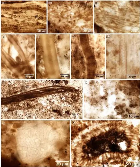 圖3 九龍灣段陡山沱組Ⅱ段硅質(zhì)結(jié)核內(nèi)的微化石光學(xué)顯微照片(a) Siphonophycus septatum;(b) Siphonophycusrobustum;(c) Siphonophycus typium;(d)Siphonophycus kestron;(e) Siphonophycussolidum;(f) Salome hubeiensis;(g)Obruchevella parva;(h) Polytrichoideslineatus;(i) Myxococcoides;(j) Wenganiaminuta;(k) Tianzhushania spinosa