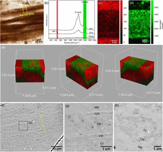 圖4 絲狀微化石Polytrichoideslineatus (P. lineatus)的拉曼顯微光譜和掃描電鏡分析(a) P. lineatus的光學(xué)顯微照片;(b) 微化石體、相鄰非化石基質(zhì)以及制備巖相薄片的環(huán)氧樹脂所對(duì)應(yīng)的拉曼光譜;(c,d) 圖像(a)中黃色實(shí)線框指示區(qū)域的石英(436-481cm-1) (c)和碳質(zhì)材料(1531-1660 cm-1)(d)的二維拉曼圖像;(e) 圖像(a)中黃色實(shí)線框指示區(qū)域的三維拉曼圖像;(f) P.lineatus的背散射掃描電鏡圖像;黃色實(shí)線顯示FIB-SEM切割位置;(g) 圖像(f)中的黑色虛線框指示區(qū)域的放大圖像;(h) P.lineatus的背散射掃描電鏡圖像(斜剖面);細(xì)胞壁(或細(xì)胞外鞘) (CW);細(xì)胞質(zhì)(Cy);非化石基質(zhì)(Mat)