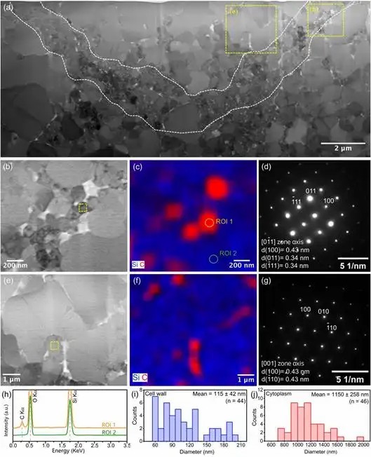 圖5 絲狀微化石Polytrichoideslineatus的透射電鏡特征(a) 圖像4f中黃色實(shí)線對(duì)應(yīng)位置獲得的超薄切片的部分HAADF-STEM圖像。白色雙曲線指示細(xì)胞壁或細(xì)胞外鞘的位置;(b) 圖像(a)中黃色虛線框指示區(qū)域的放大圖像,顯示細(xì)胞壁或細(xì)胞外鞘內(nèi)的納米級(jí)石英顆粒;(c) 圖像(b)對(duì)應(yīng)的Si(藍(lán)色)和C(紅色)的元素空間分布的疊加圖;(d) 圖像(b)中的黃色虛線框指示區(qū)域的SAED圖像,對(duì)應(yīng)石英晶粒的[0-11]帶軸;(e) 圖像(a)中黃色虛線框指示區(qū)域的放大圖像,顯示細(xì)胞質(zhì)內(nèi)的微米級(jí)石英顆粒;(f) 圖像(e)對(duì)應(yīng)的Si(藍(lán)色)和C(紅色)的元素空間分布的疊加圖;(g) 圖像(e)中的黃色虛線框指示區(qū)域的SAED圖像,對(duì)應(yīng)石英晶粒的[001]帶軸;(h) 圖像(c)中ROI1(富碳物質(zhì))和ROI2(石英顆粒)標(biāo)記區(qū)域的STEM-EDXS譜圖;(i,j) 細(xì)胞壁(或細(xì)胞外鞘) (i)和細(xì)胞質(zhì)(j)中石英顆粒的粒徑分布