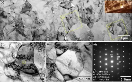 圖6 絲狀微化石Polytrichoideslineatus相鄰的非化石基質(zhì)的透射電鏡特征(a) 非化石基質(zhì)的亮場(chǎng)TEM圖像;右上角插圖顯示FIB-SEM切割位置;(b,c) 圖像(a)中的黃色虛線框指示區(qū)域的放大圖像,顯示非化石基質(zhì)中形狀規(guī)則,緊密堆積的石英顆粒;(d) 圖像(b)中黃色虛線框指示區(qū)域的SAED圖像,對(duì)應(yīng)石英晶粒的[0-11]帶軸