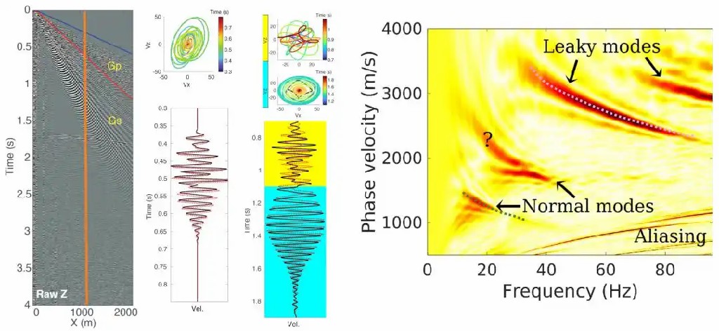圖1 采集于西南極冰蓋的主動源地震波形數(shù)據(jù)和對應的頻率-相速度譜。地震面波由于頻散其時間域波形十分復雜,采用波形反演方法極容易陷入局部極小值;所對應的頻率-相速度譜較波形有更簡單的形式,同時也保留了用于約束速度反演的關鍵頻散信息