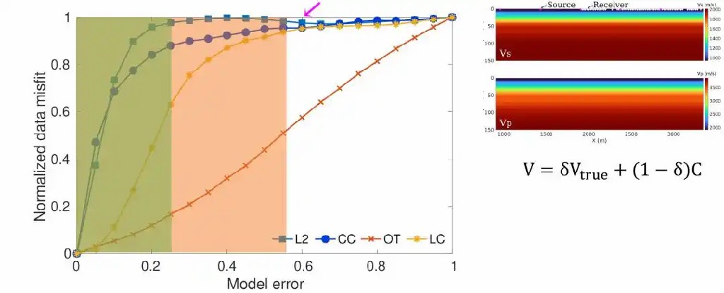 中國科學院地質(zhì)與地球物理研究所深層油氣理論與智能勘探開發(fā)重點實驗室張振東特聘研究員、劉伊克研究員聯(lián)合沙特阿卜杜拉國王科技大學Tariq Alkhalifah教授,提出了波動方程地震面波全頻散譜反演方法。該方法將傳統(tǒng)一維面波頻散曲線反演方法和最新的地震全波形反演理論相結合,通過數(shù)值方法求解彈性波波動方程模擬地震面波在任意復雜介質(zhì)中的傳播過程,避免了傳統(tǒng)方法對地下結構的層狀模型近似;將復雜的地震面波波形變換到保留其頻散特征的頻散譜域進行數(shù)據(jù)比較(圖1),避免了拾取頻散曲線且可以自動利用各階頻散信息;提出了頻散譜相減、頻散譜全局互相關、頻散譜最優(yōu)輸送和頻散譜局部互相關四種目標函數(shù),比較了不同目標函數(shù)的凹凸性、找到了一種全局最優(yōu)目標函數(shù)(圖2)。借助全波形反演統(tǒng)一理論框架,使用伴隨狀態(tài)法計算速度模型梯度和局部優(yōu)化算法迭代更新速度模型,可實現(xiàn)大規(guī)模地震資料的自動處理。該反演思想可推廣至一般反問題,即將復雜的地震波形變換到保留其主要特征的簡單空間(如神經(jīng)網(wǎng)絡的隱空間)進行比較,降低反演的非線性。隨著油氣、地熱、二氧化碳封存等陸地勘探目標的涌現(xiàn),該方法有望為陸地和淺海探區(qū)高精度速度建模提供一種新的解決方案。