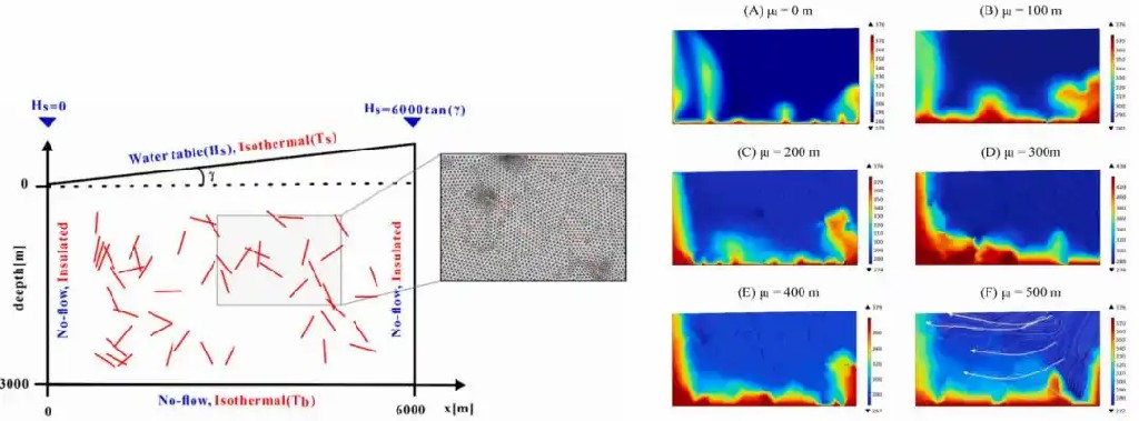 在全球能源問(wèn)題緊張和氣候變暖背景下,地?zé)崮茏鳛橐环N分布廣泛的清潔可再生能源近年來(lái)備受關(guān)注。隨著向地球深部要熱的需求增加,巖土體中的裂隙被愈加重視。在深部致密條件下,低滲孔隙對(duì)地?zé)崃黧w的影響逐漸降低,天然和人工裂隙成為主要的滲流換熱介質(zhì)。它們通常相互交錯(cuò)形成錯(cuò)綜復(fù)雜的裂隙網(wǎng)絡(luò),裂隙網(wǎng)絡(luò)的分布和形態(tài)都會(huì)極大地影響地?zé)崃黧w的傳熱過(guò)程,然而是否裂隙越長(zhǎng)越密便會(huì)加強(qiáng)熱對(duì)流?其背后的驅(qū)動(dòng)機(jī)理尚不清楚,這是地?zé)崮荛_(kāi)發(fā)向深層進(jìn)軍的關(guān)鍵科學(xué)問(wèn)題。