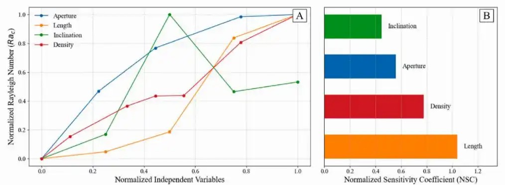 此外,為定量評(píng)估地?zé)嵯到y(tǒng)的開(kāi)發(fā)利用潛力,研究團(tuán)隊(duì)定義了一個(gè)反映系統(tǒng)的可持續(xù)性和穩(wěn)定性的參數(shù)——地?zé)嵯到y(tǒng)采熱效率,其為熱儲(chǔ)層在特定時(shí)刻釋放的熱量相對(duì)于總熱儲(chǔ)量的比例。結(jié)果顯示,在天然狀態(tài)下,中等開(kāi)度、長(zhǎng)度、傾角和密度的裂隙網(wǎng)絡(luò)具有最高的采熱效率,這與臨界Rayleigh數(shù)開(kāi)始急劇增加的閾值一致,意味著自由熱對(duì)流和強(qiáng)制熱對(duì)流強(qiáng)度相近時(shí)地?zé)嵯到y(tǒng)的換熱能力最強(qiáng)(圖3)??紤]系統(tǒng)穩(wěn)定性,研究團(tuán)隊(duì)認(rèn)為:存在有限數(shù)量的、開(kāi)度較大、長(zhǎng)度中等并以45°傾斜交叉的裂隙網(wǎng)絡(luò)(50條、0.08-0.1m、300m)是裂隙性巖溶儲(chǔ)層地?zé)豳Y源開(kāi)發(fā)的有利靶區(qū)。
