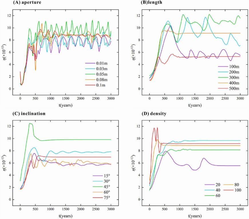 圖3 不同裂隙幾何特性對(duì)地?zé)嵯到y(tǒng)采熱效率的影響。(A)開(kāi)度;(B)長(zhǎng)度;(C)傾角;(D)密度